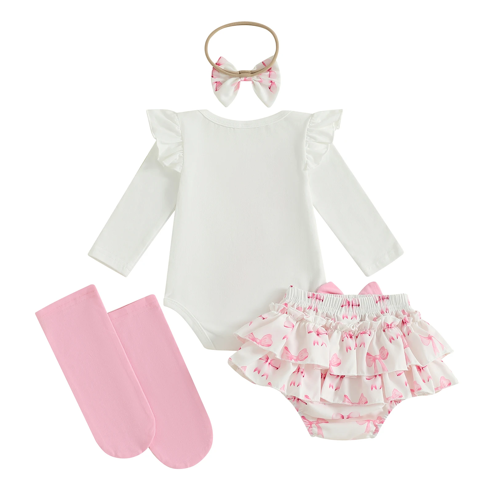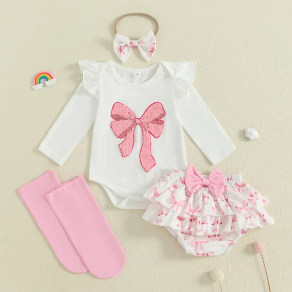 Baby Girl Fall Outfits Bow Embroidered Round Neck Long Sleeve Romper Elastic Waist Shorts Headband Socks 4Pcs Clothes Set