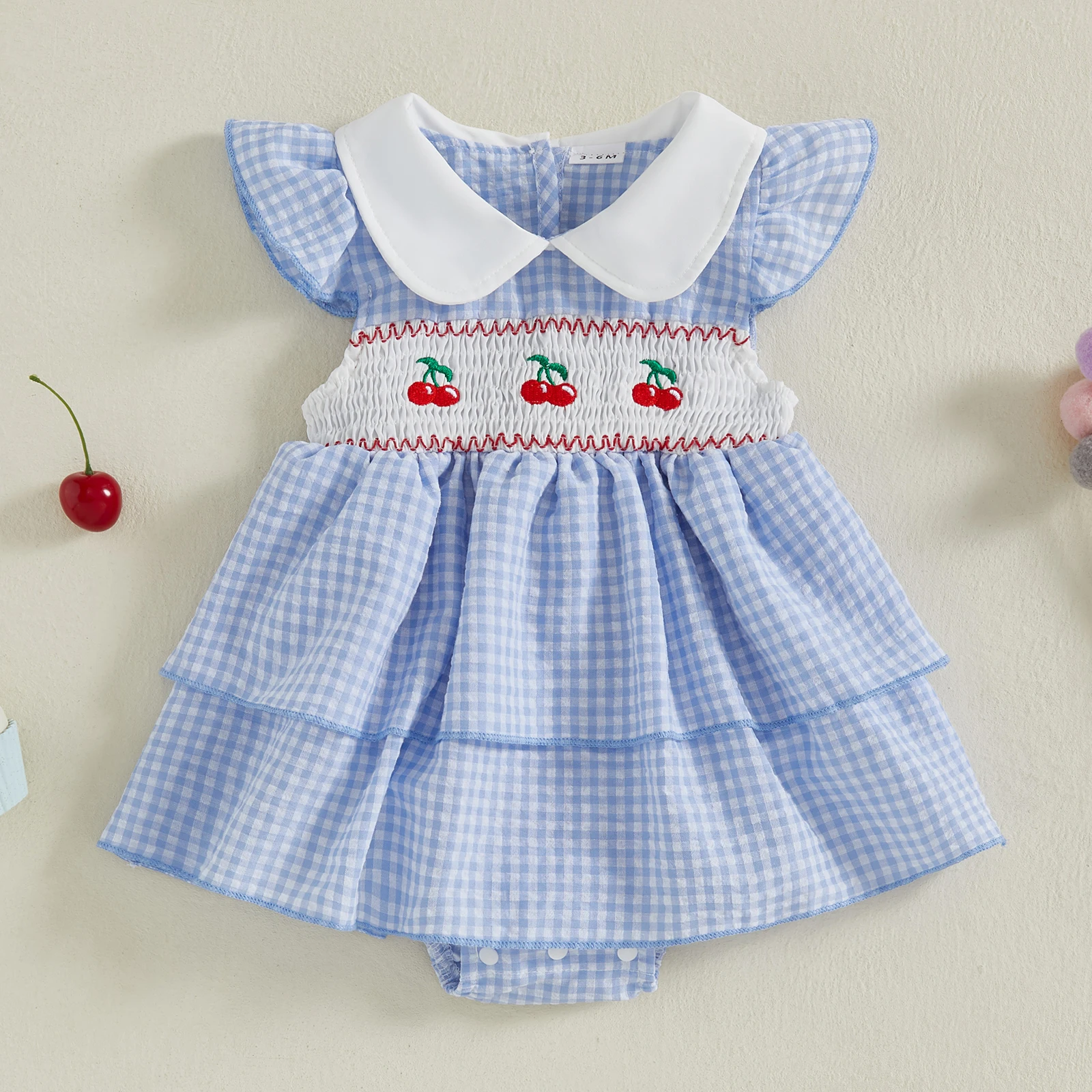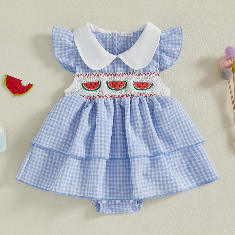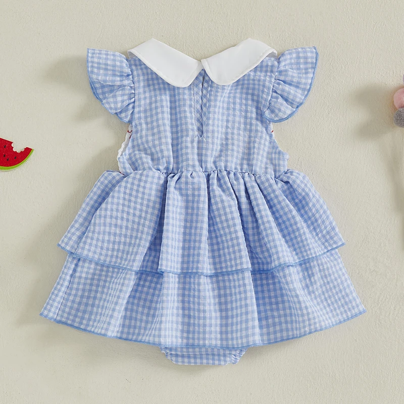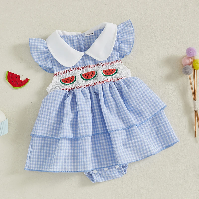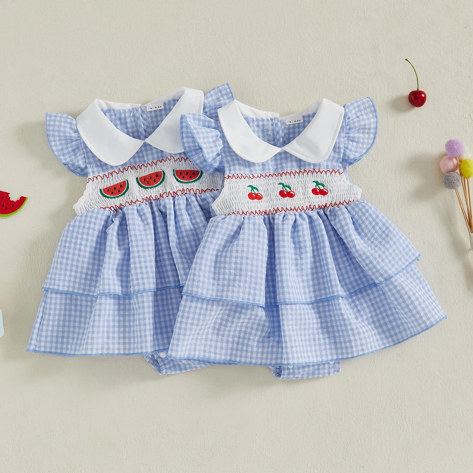 Baby Girl Plaid Romper Dress Watermelon/Cherry Embroidered Smocked Doll Collar Flying Sleeve Bodysuit Cute Summer Clothes