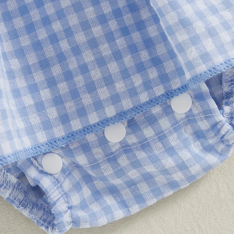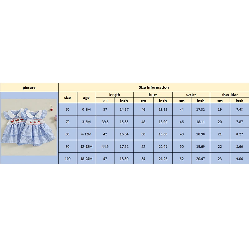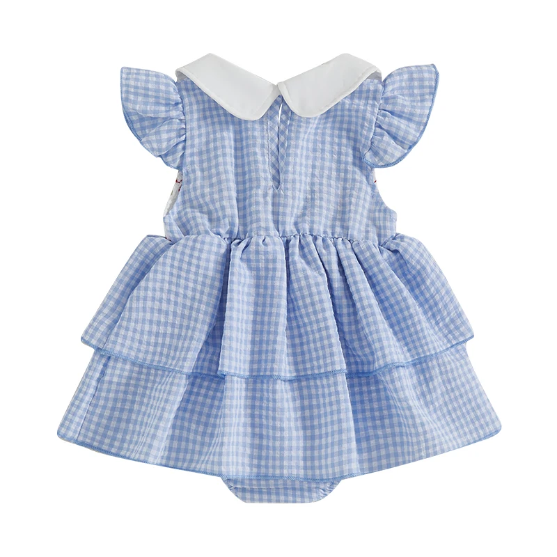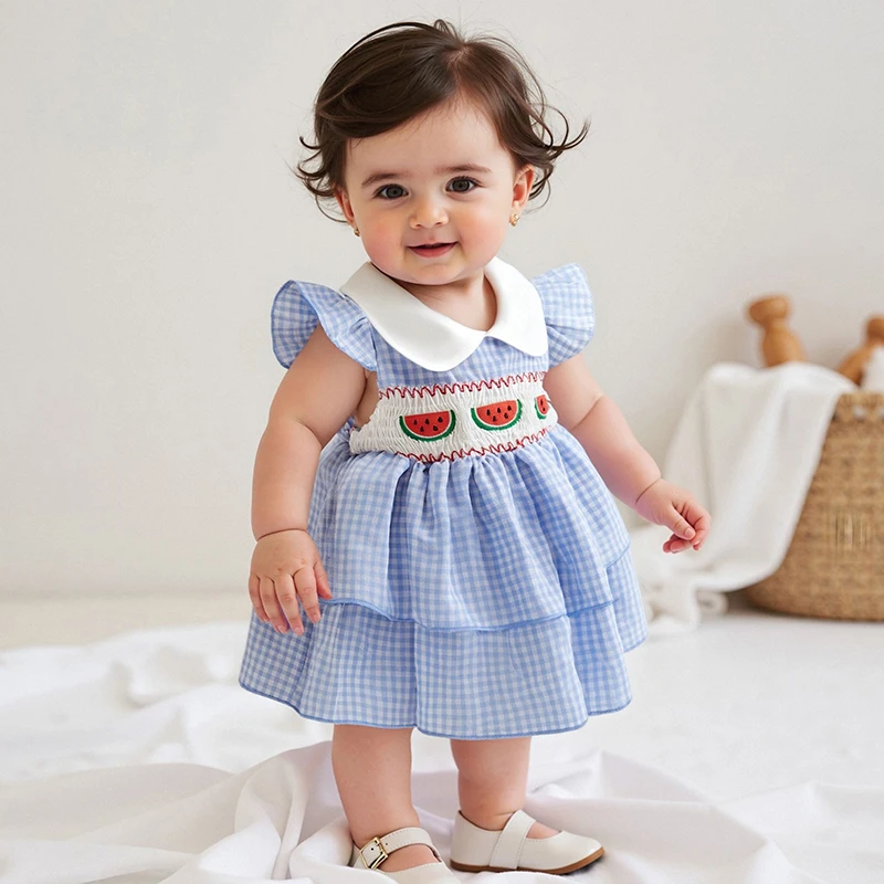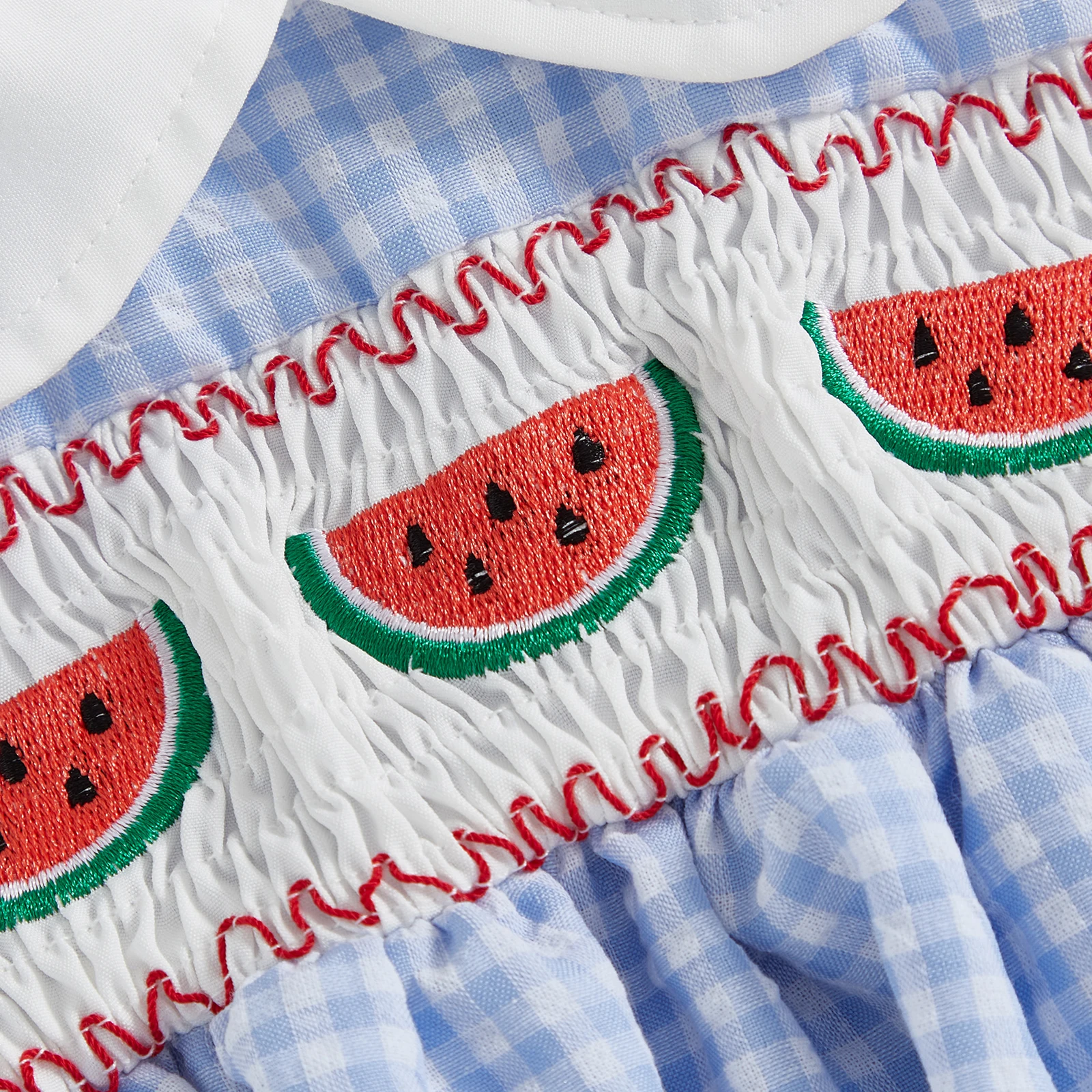 Baby Girl Plaid Romper Dress Watermelon/Cherry Embroidered Smocked Doll Collar Flying Sleeve Bodysuit Cute Summer Clothes