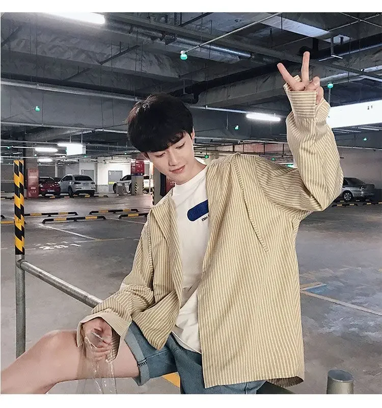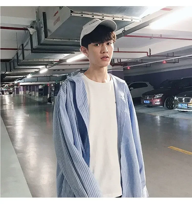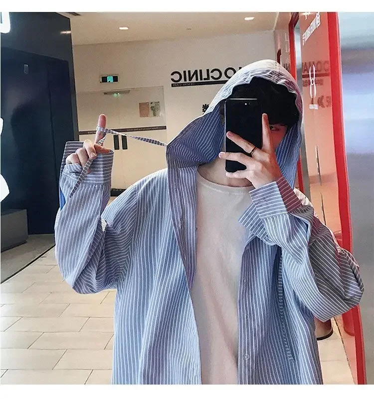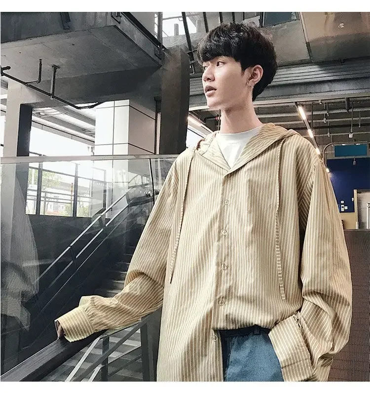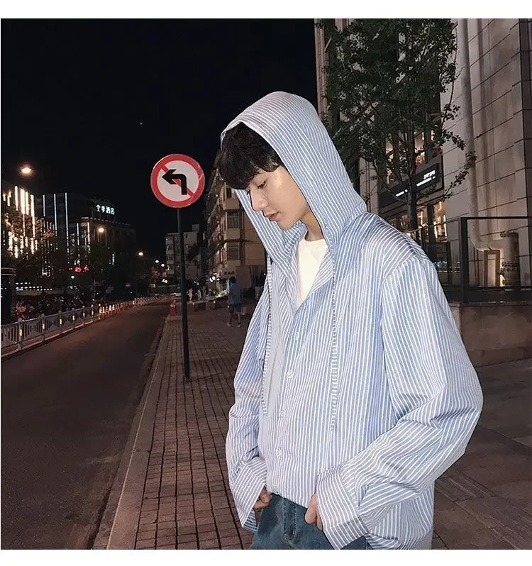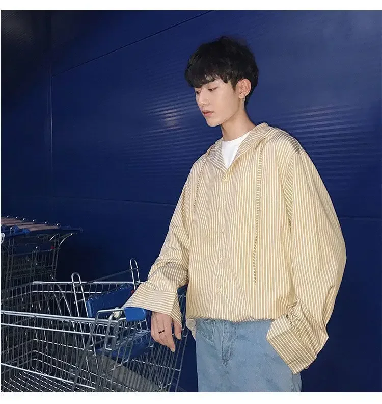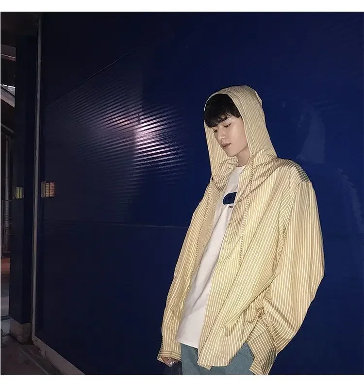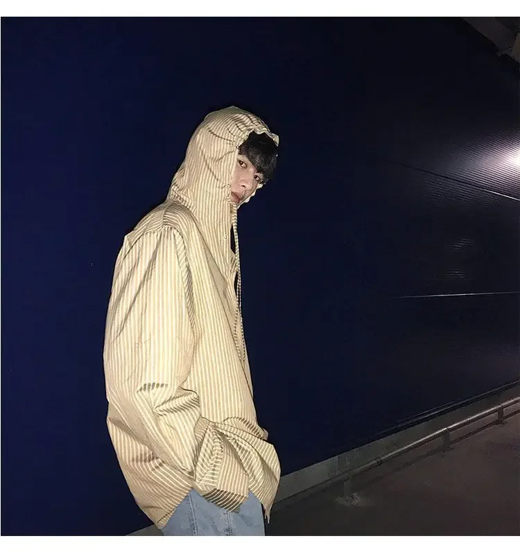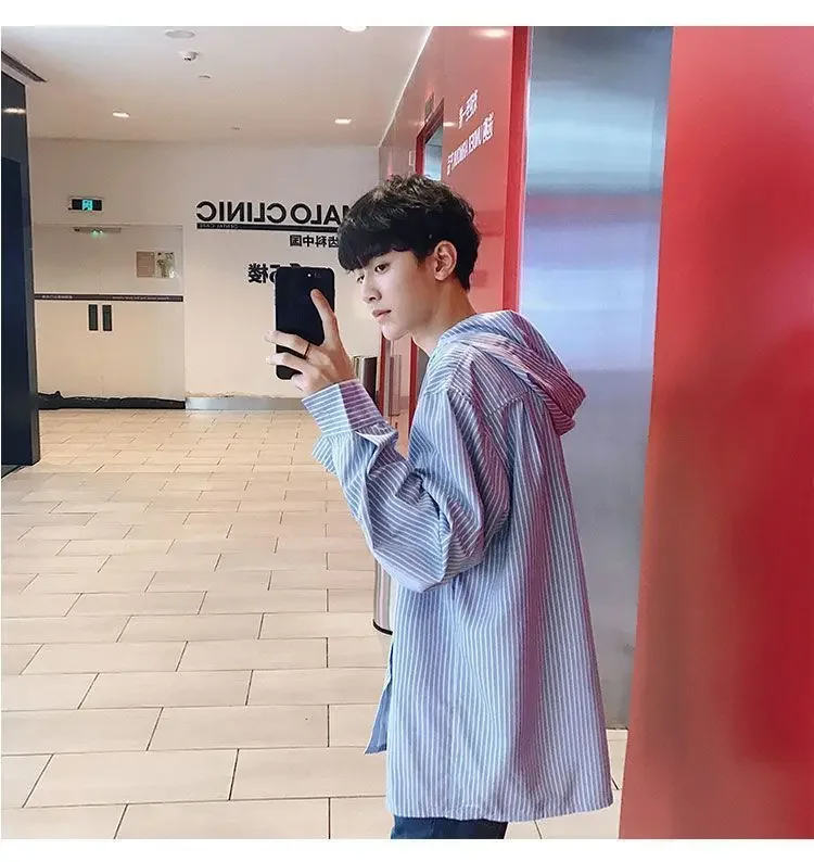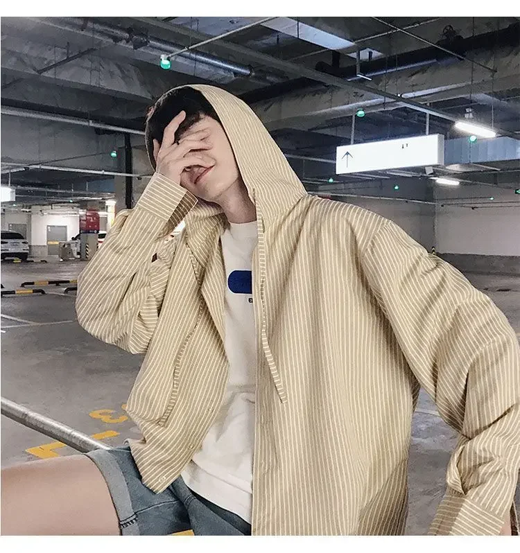 Chic Men Korean Style Trendy Hooded Loose Striped Long Sleeve Shirt Thin Jacket