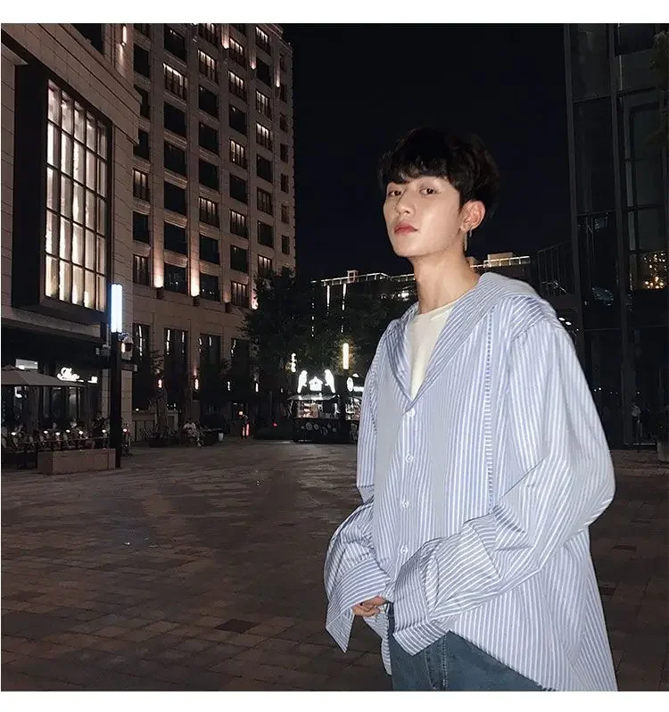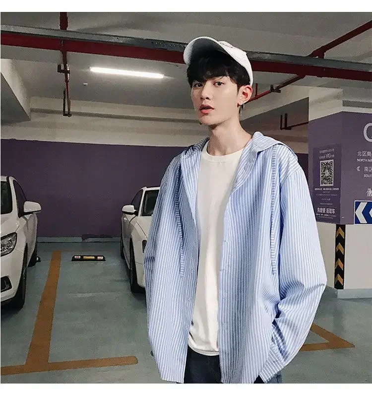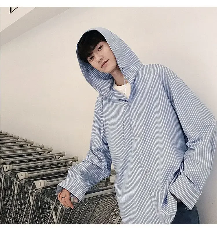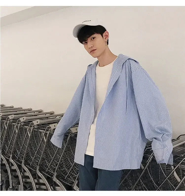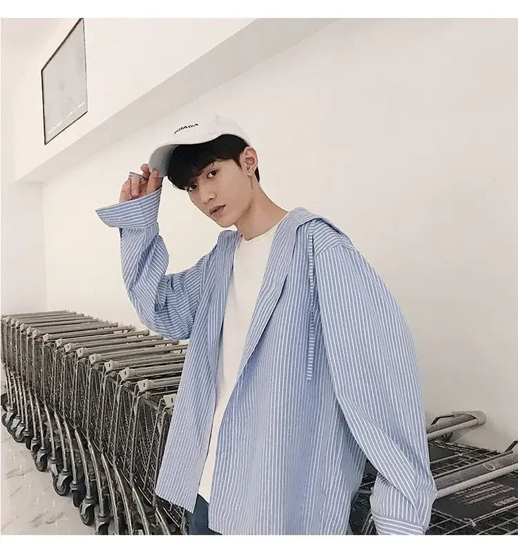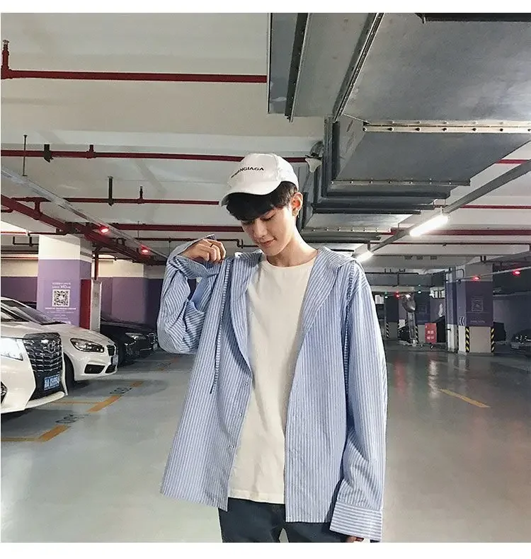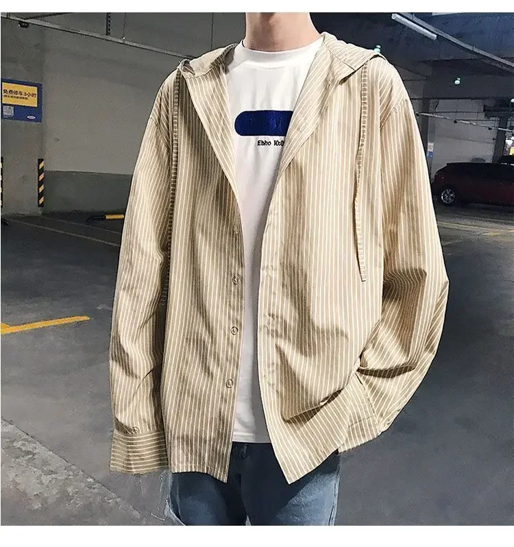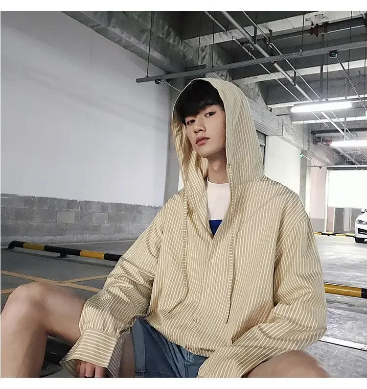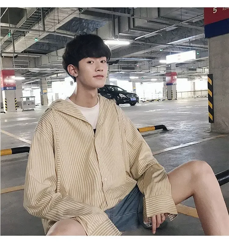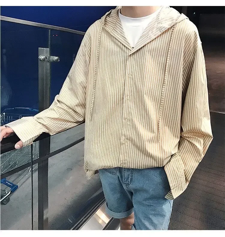 Chic Men Korean Style Trendy Hooded Loose Striped Long Sleeve Shirt Thin Jacket