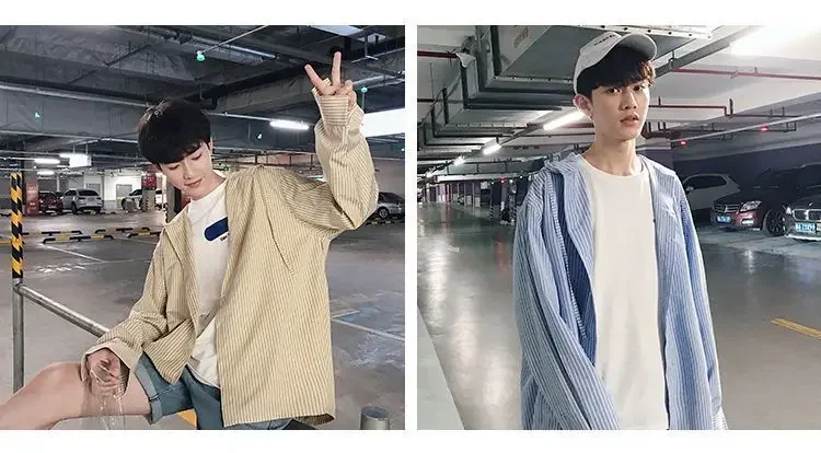 Schreibe die erste Rezension für „Chic Men Korean Style Trendy Hooded Loose Striped Long Sleeve Shirt Thin Jacket“