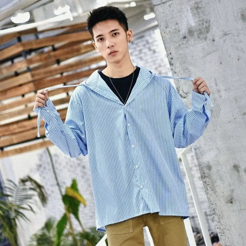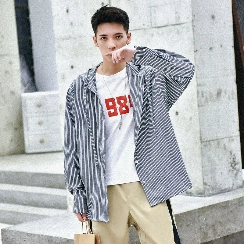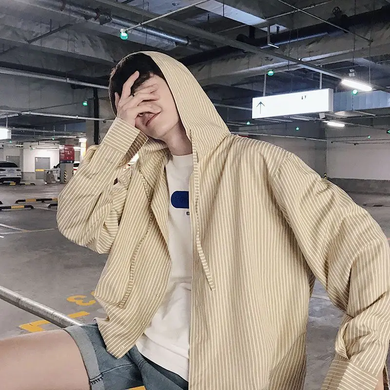 Chic Men Korean Style Trendy Hooded Loose Striped Long Sleeve Shirt Thin Jacket